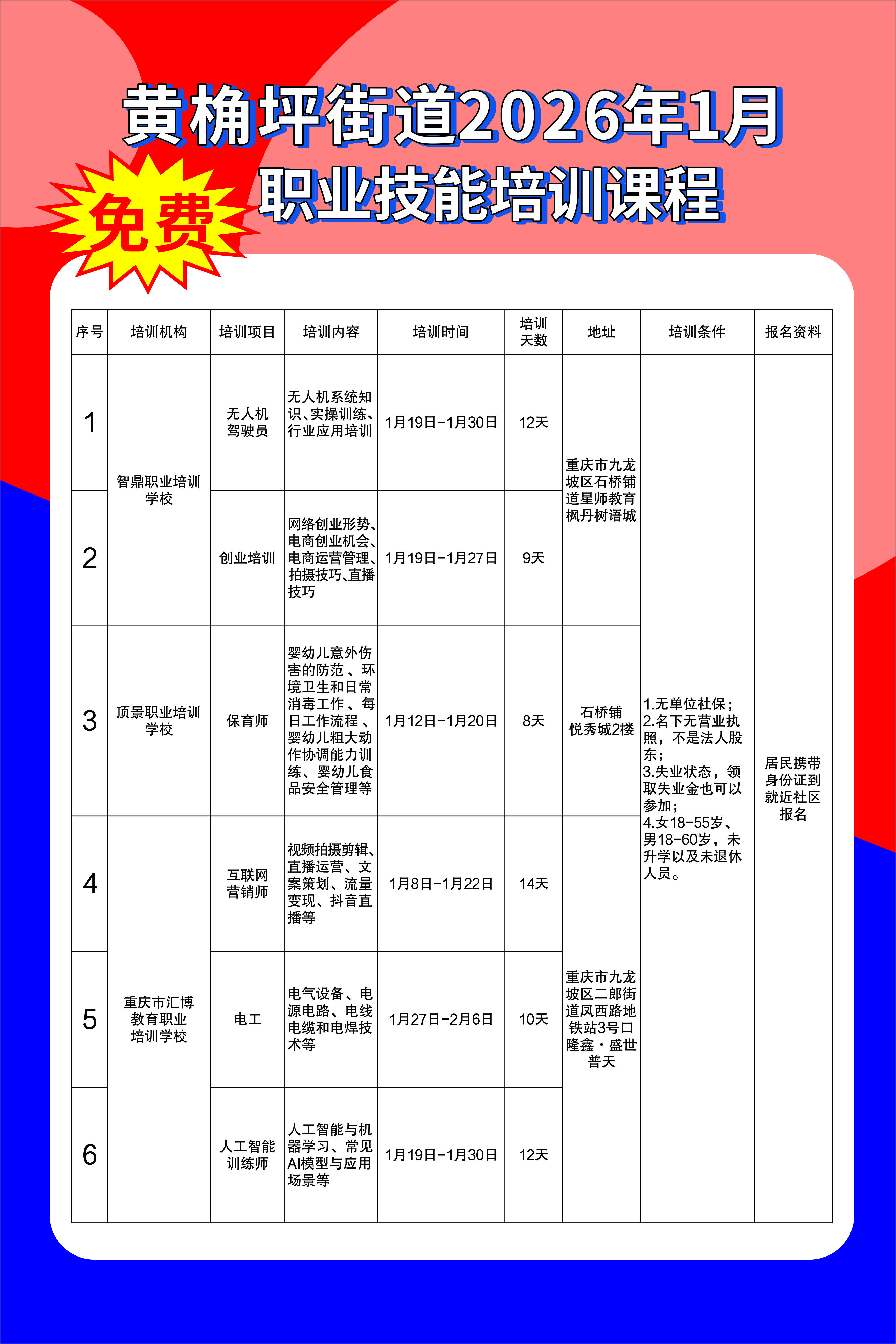 社区公益 | 黄桷坪街道2026年1月职业技能培训课程