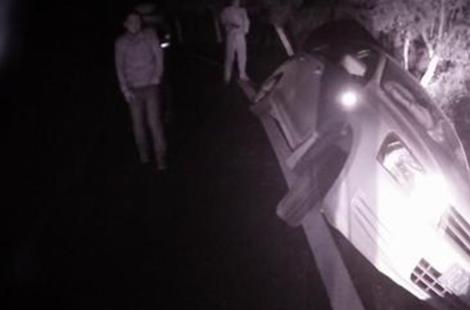 轿车翻出路面倾斜60度 司机和乘客竟在车内睡大觉