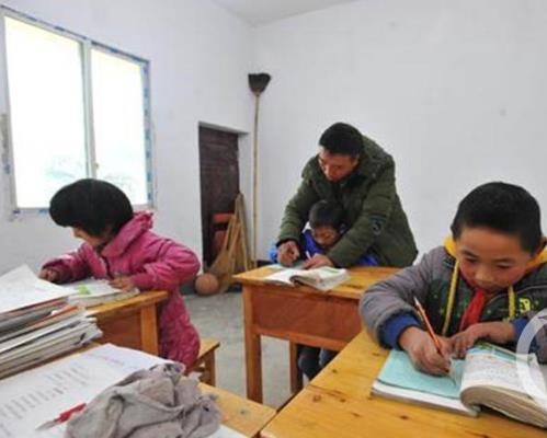 穿得有些泛黑的棉袄、朴实的棉拖鞋。他叫陈大明,是双塘村小学唯一的老师,在他身前,三张课桌呈“品”字型排开,三名学生聚精会神的拿着书本跟着老师朗读,三名学生也是这所小学仅有的三名学生。
