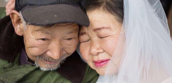 他原本计划也要给外公换西装拍摄,但外公身体不好,怕老人家不方便,就没换衣服。外婆单独拍摄结束后,就是给两人拍摄合影。这时,外公走到外婆身边,坐了下来。外婆轻轻把头靠在外公肩上,手与外公握在一起,闭上眼睛,露出微笑,外公也忍不住笑了。