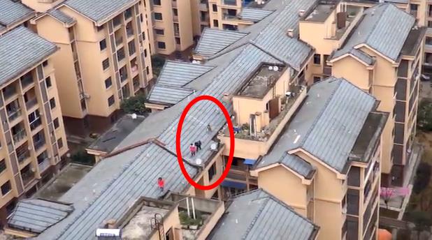 熊孩子楼顶“表演”蜘蛛侠 屋顶行走翻上翻下