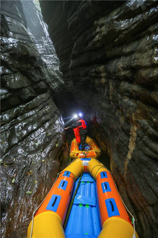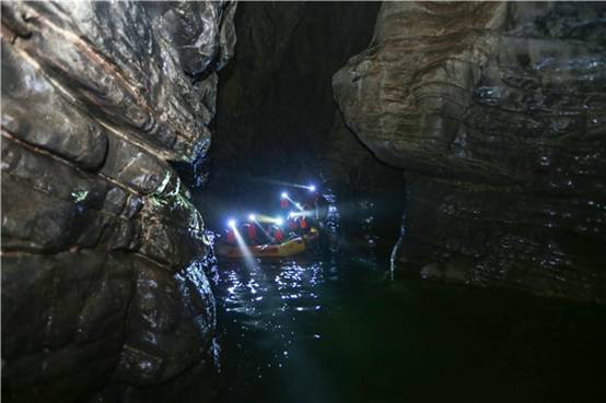 行至峡谷底部,有一条清澈的河流,沿着该河流一直通往洞内,这也使得洞内洞外的风景各具其独特的景观,而又紧紧相通。由于皮划艇的滑行,惊得河流两岸的青蛙直往水里跳。进入洞穴内,地下暗河更加湍急且水温较低。洞内时而狭窄只能容一人通过,时而宽阔,使得探照灯无法照到空旷的尽头。
