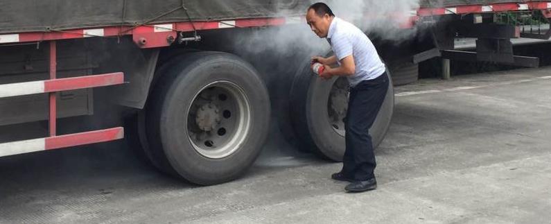 6月1日中午,重庆高速公路一支队四大队执法人员在渝武高速合阳路段巡逻时,发现正在高速公路上行驶的陕V01386大货车左后轮爆胎了,且轮胎有冒烟的现象。高速执法人员立即通过喊话器,责令驾驶员立即从前方合川合阳收费站下道处置。当大货车监护到合川合阳收费站广场时,该车轮胎冒烟越来越大,且左后轮胎已有明火冒出。执法人员立即对合阳收费站进行交通管制,驾驶员惊慌下车使用灭火器及时灭火,所幸未造成更大损失。
