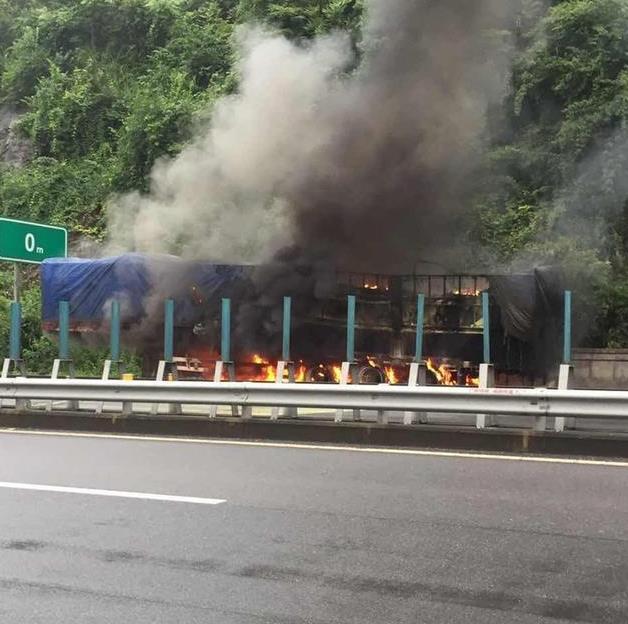 渝湘高速一载土石灰粉货车发生自燃 幸无人员伤亡