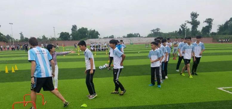 随后,教练组通过生动的肢体动作语言,给大家讲解了脚外侧运球、脚内侧传球等基本的技术要领,示范并纠正同学们在训练中存在的问题。虽然语言不通,但是通过足球这一共同语言,教练与同学们亲切互动,笑声、喝彩声不断。第二节专项足球训练课中,同学们被分小组分别进行绕杆运球射门、5人小场地比赛、3人协作头顶传球比赛等训练。同学们在阿根廷教练的指导下,循环轮回的训练,感受团队配合以及进球带来的快乐。