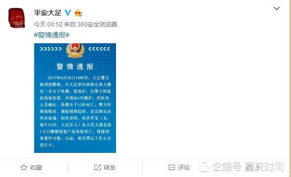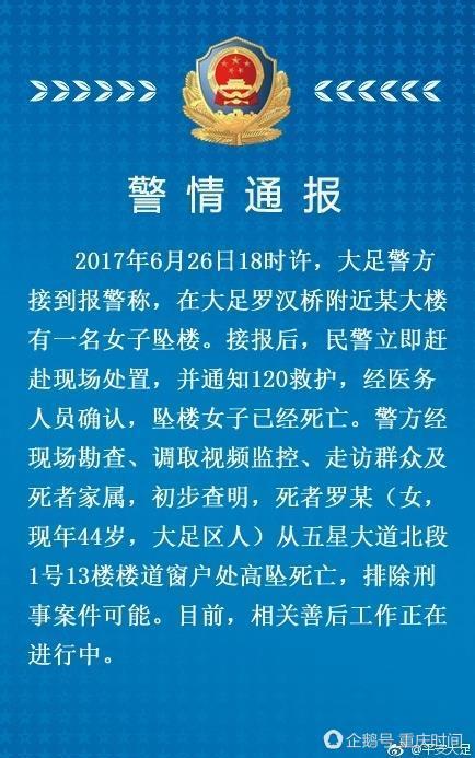 2017年6月26日18时许,大足警方接到报警称,在大足罗汉桥附近某大楼有一名女子坠楼。接报后,民警立即赶赴现场处置,并通知120救护,经医务人员确认,坠楼女子已经死亡。警方经现场勘查、调取视频监控、走访群众及死者家属,初步查明,死者罗某(女,现年44岁,大足区人)从五星大道北段1号13楼楼道窗户处高坠死亡,排除刑事案件可能。目前,相关善后工作正在进行中。