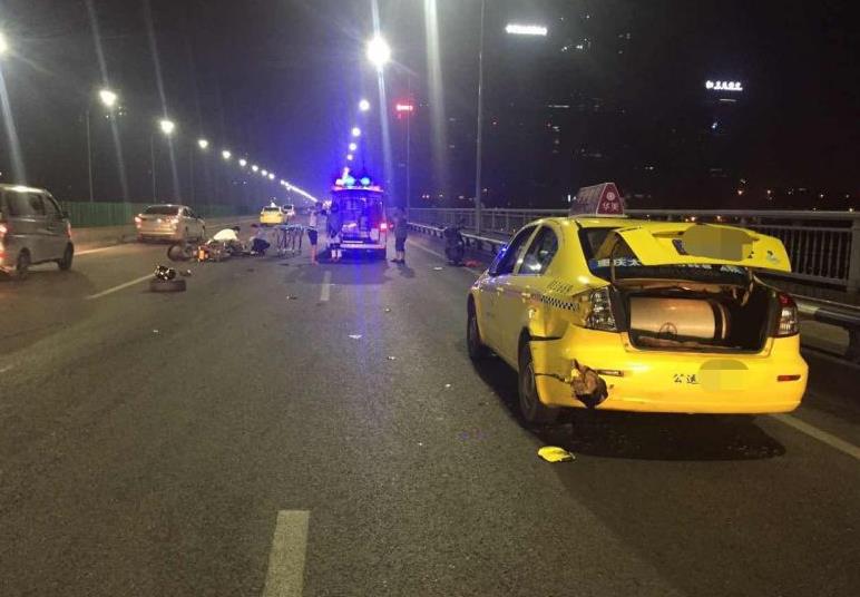 凌晨三时许,在南岸往江北方向的黄花园大桥桥面上,发生了一起追尾事故,一辆摩托撞上了停在路边的出租车。