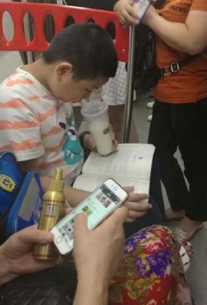 地铁上少年专心看书 周围大人全在看手机