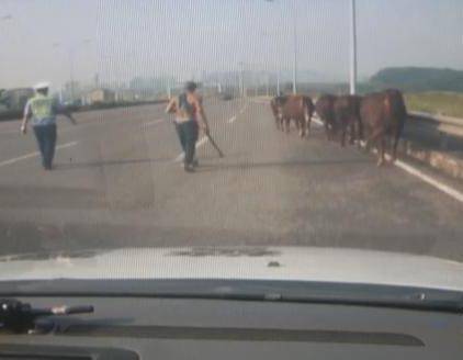 一群牛高速超车道上漫步 交巡警变身“赶牛郎”