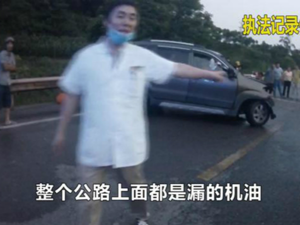 遭遇撞击后,两辆车的车头部分已完全变形,整个路面上漏满机油。