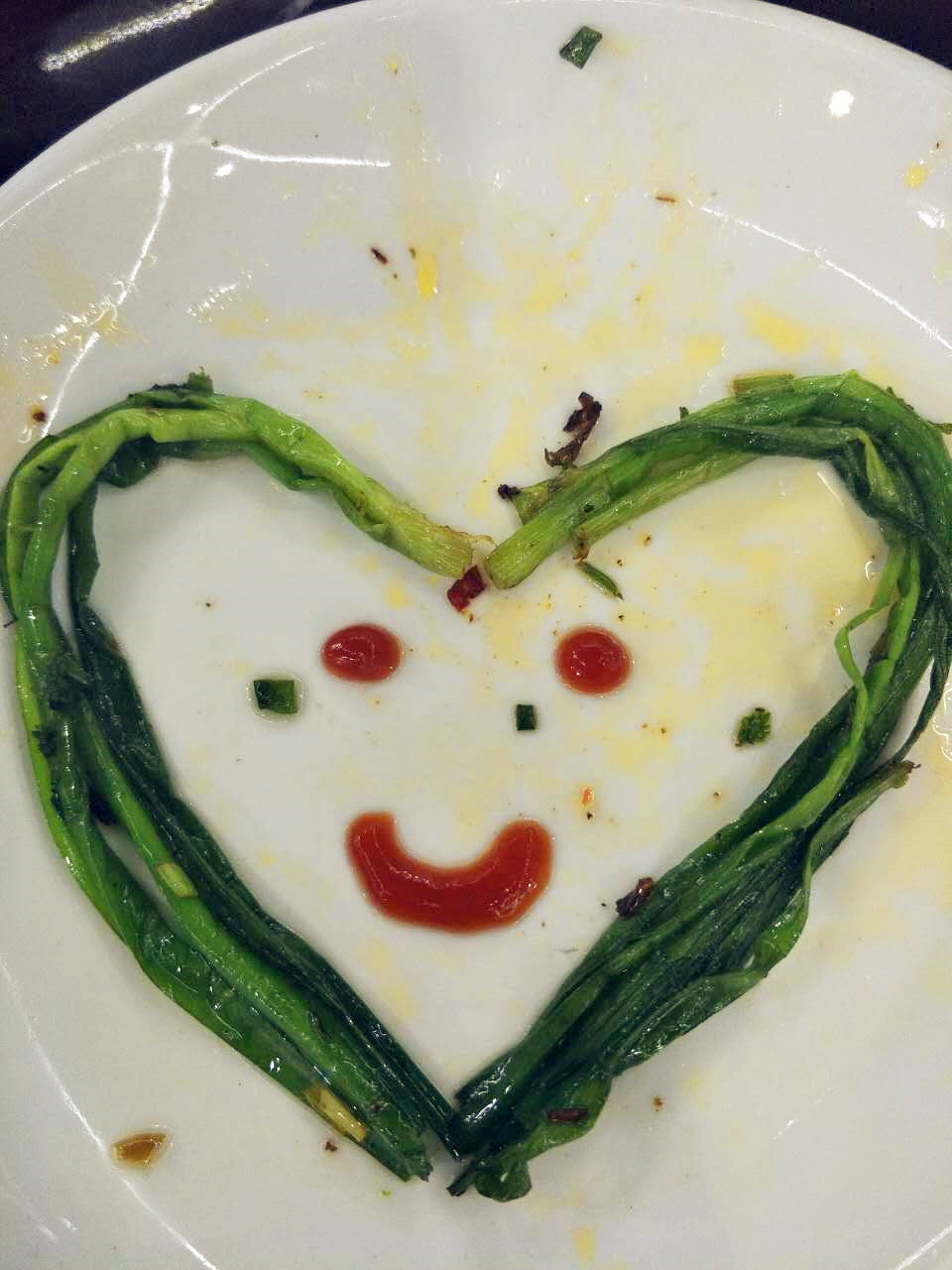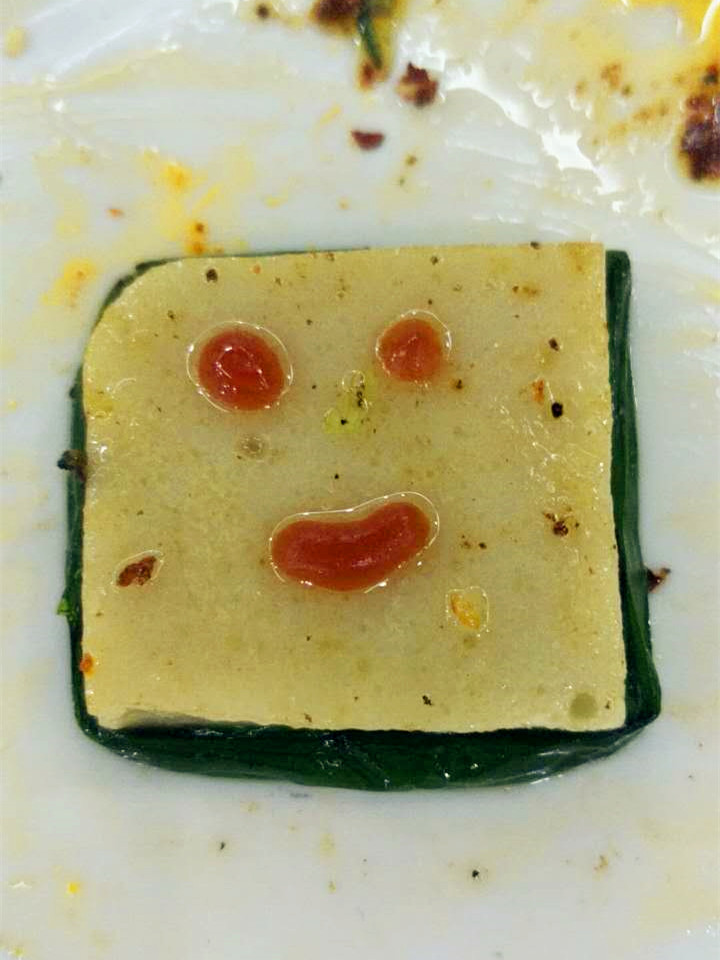 小云说,这是韭菜和蕃茄酱组合在一起的“爱心脸”,再有三点碎菜用来点缀成鼻子及脸颊,是周末脸。
