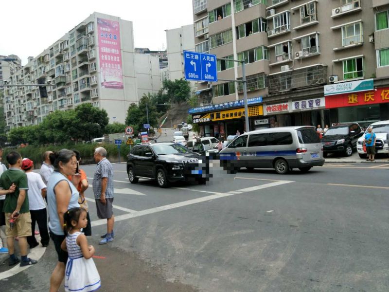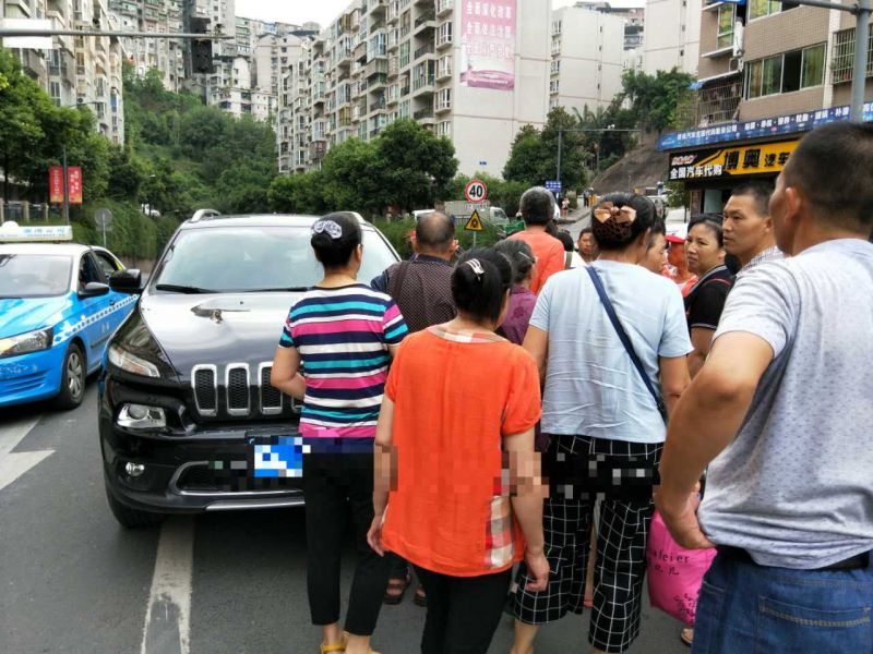 8月31日下午17点30分左右,记者途经忠县城区中博隧洞亿越汽车销售有限公司外红绿灯处,看见一群人正在合力将一辆黑色Jeep越野车的车头缓缓抬起,原来是在救援一个左脚不慎被卷入车轮下,年约三四岁的小男孩。