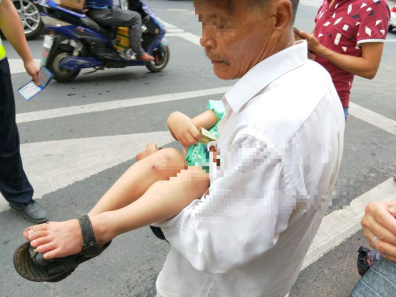 小孩过马路被卷入车轮 小脚被碾很心疼