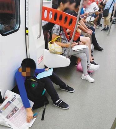 9月21日早上7点多钟,市民胡先生搭乘1号线上班,列车在两路口站开门后,一名身穿蓝色上衣的小男孩进入车厢,直接坐在车门边,紧接着拿出作业本就开始写。