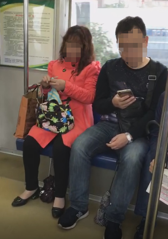 2017年10月12日早上,市民秦女士在重庆轨道交通2号线车厢内看到一位身穿橙红色大衣的中年阿姨,坐在靠门较近的座位上织毛衣。