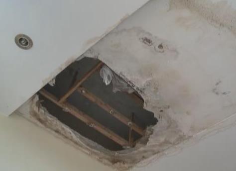 女子家客厅天花板现一个大窟窿 地面一片狼藉