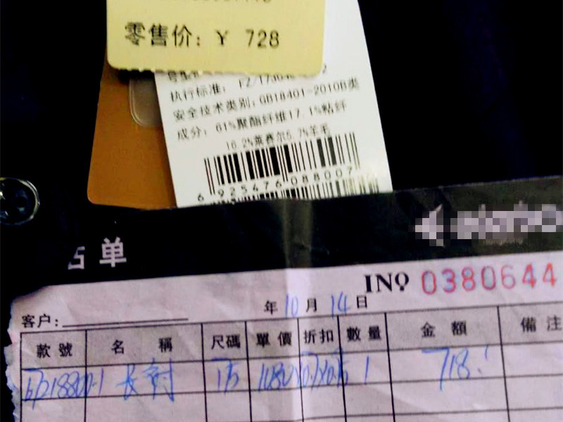 郑先生说,朋友于10月14日,在重庆綦江电力街某品牌服装店里,购买了一件衣服,当时的吊牌价亲眼目睹是1080元,买的时候刚好遇上了打折,折后总价为718元。