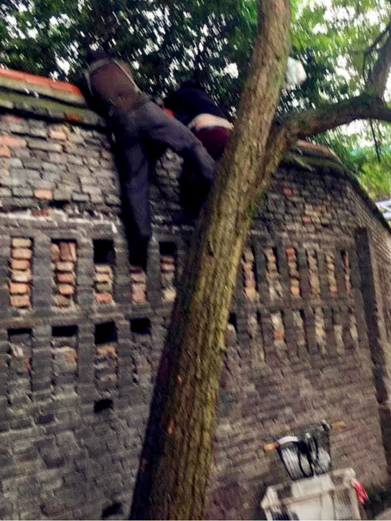白同学说,看着商贩、外卖小哥这么高的墙,都可以踩着一旁的树爬上墙去,自己只能说这些商贩、外卖小哥真是太拼了。