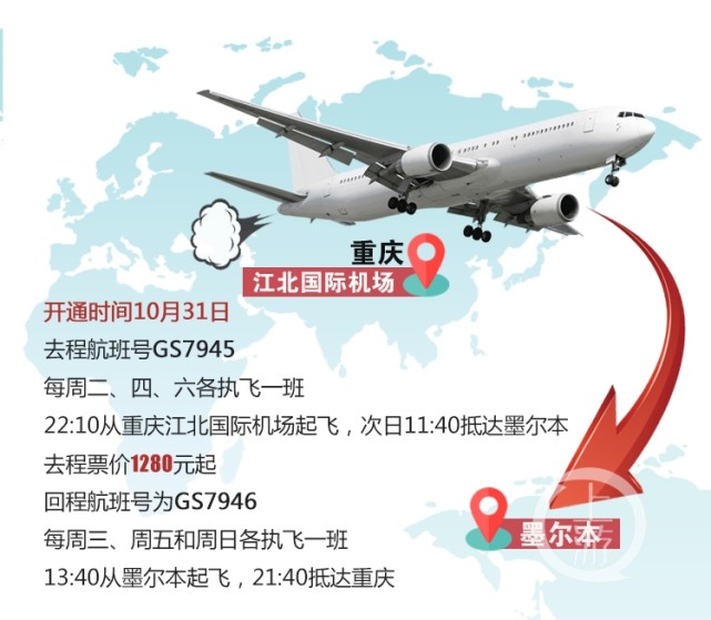 10月31日晚,天津航空航班GS7945从江北机场飞往墨尔本。这是重庆首条直飞墨尔本航线,全程飞行时间约为10.5小时。航班由空客A330宽体客机执飞,去程票价1280元起。