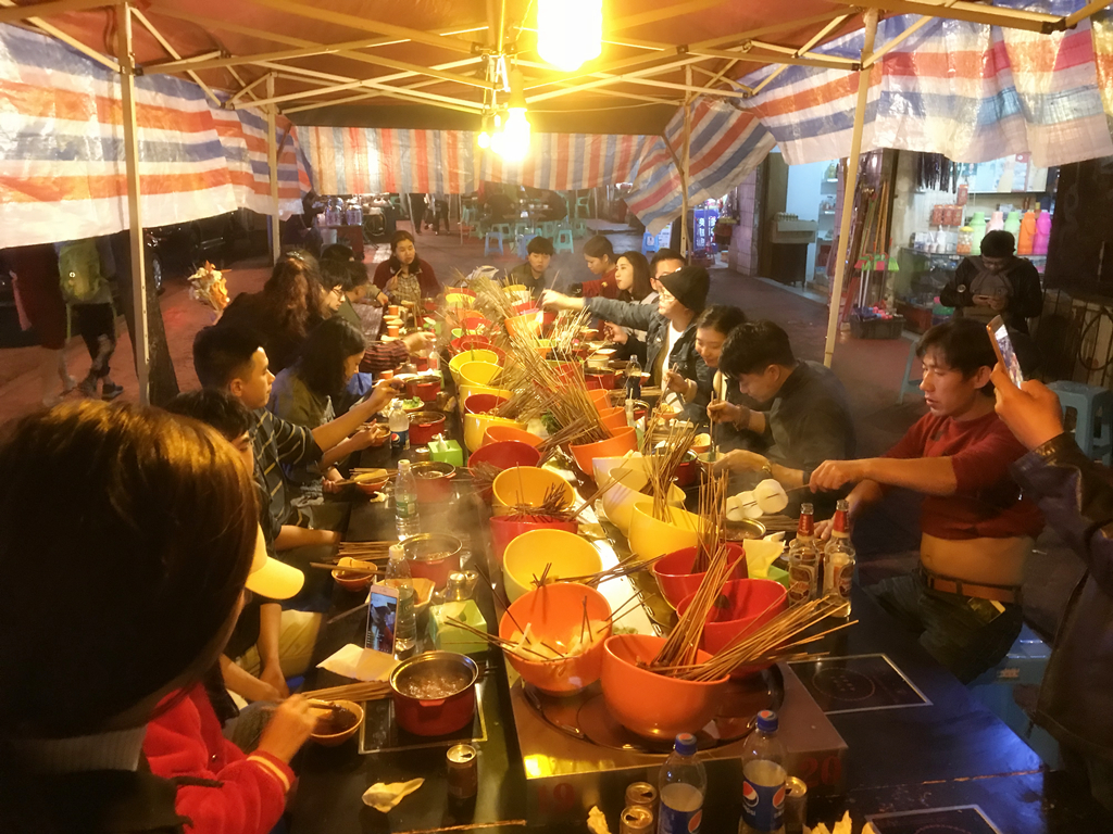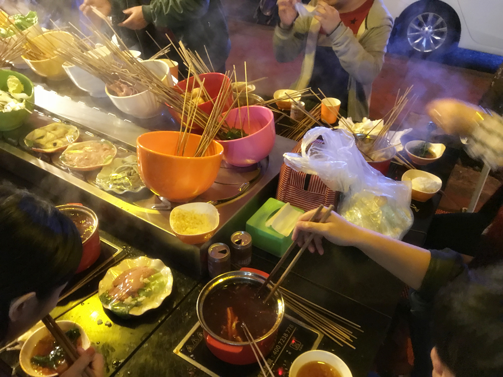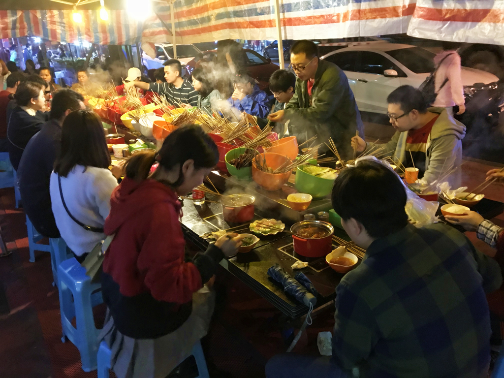 重庆街头现旋转串串火锅 20多人吃一桌很热闹