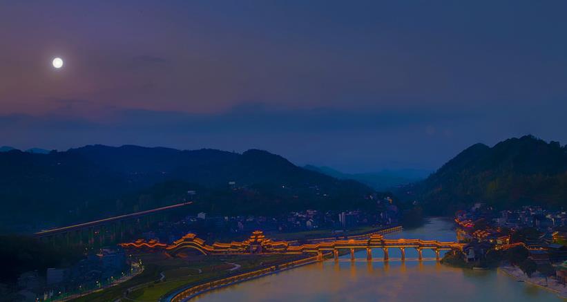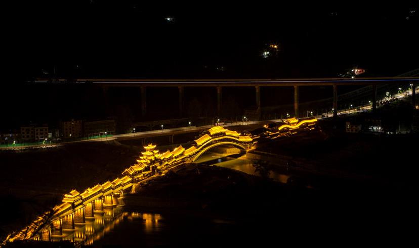 黔江位于重庆市东南部,山多桥也多,“七山二水一分田”是其真实写照。一座座大大小小的木构廊桥在为当地居民遮风避雨、提供休憩纳凉以及通行之便的同时,见证了当地土家苗汉儿女砥砺奋斗、生生不息的生活画卷。夜幕降临,华灯初上,濯水风雨廊桥宛如江上游龙。