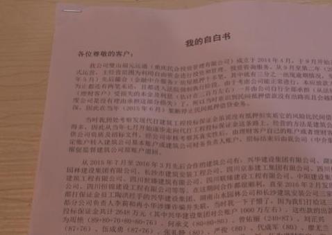 严俊说,公司法人巫某临走前发了告白书,告白书称:因为借出去的资金没能及时收回,导致资金链断裂,他不是欺骗大家,而是不堪重负,所以选择了暂时离开。