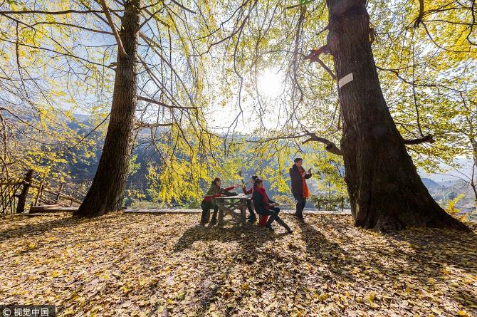 游客在重庆市南川区德隆镇银杏村游玩。(来源:视觉中国)