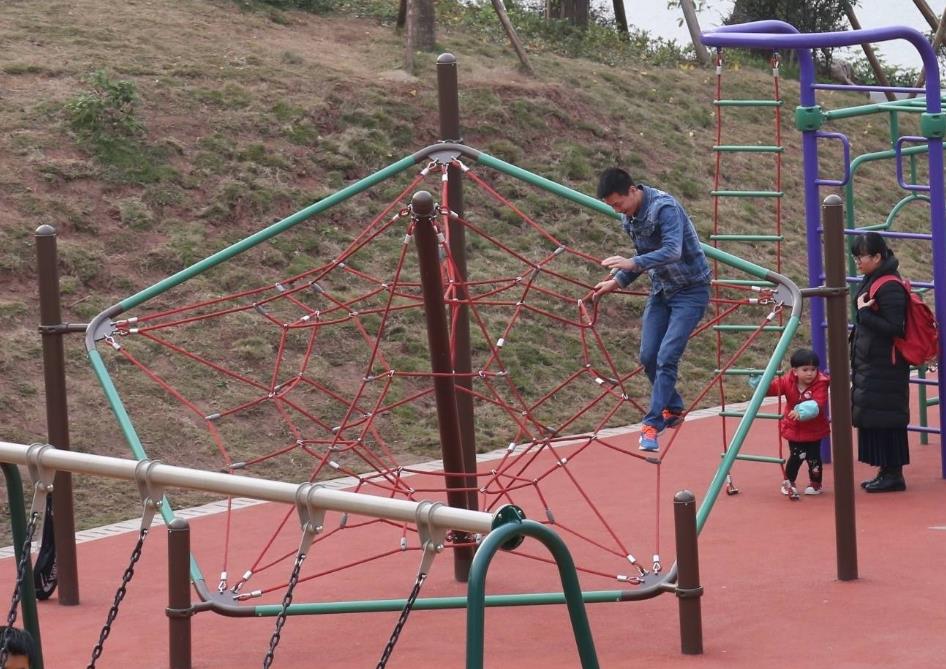 滑滑梯、秋千、游乐绳网、跷跷板……在东岳体育公园,这些游乐项目深受小朋友的喜爱。