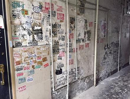 金港苑位于南坪南兴路,建于1998年,共有8栋楼梯房,住着200多户居民。12月6日上午,记者来到这里,小区入口除了一个汽车道闸外,并无保安值守,任何人都可以随意进出。记者随意走进一栋居民楼,只见楼道两边的墙壁上,密密麻麻张贴或印上各种各样的小广告,有办证的,有开锁的,有疏通管道的,还有家电维修的……有的地方实在贴不下了,就贴在原来的小广告上面,一层一层地贴在墙壁上,十分显眼,不由得让人产生“密集恐惧症”。