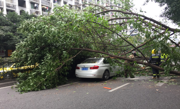 倾倒的是一颗黄葛树,被砸中的是一辆外地牌照的白色宝马车。由于倒下的黄葛树枝繁叶茂占据了几条车道,相关部门已经赶到进行处理。