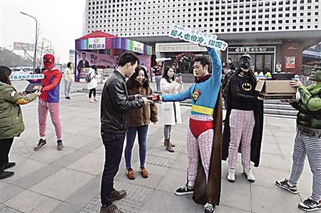 超级英雄 “空降”写字楼派发礼物 穿的是秋裤
