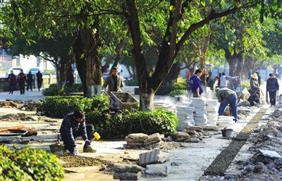 万州区北滨路修补人行道地砖 营造舒适出行环境