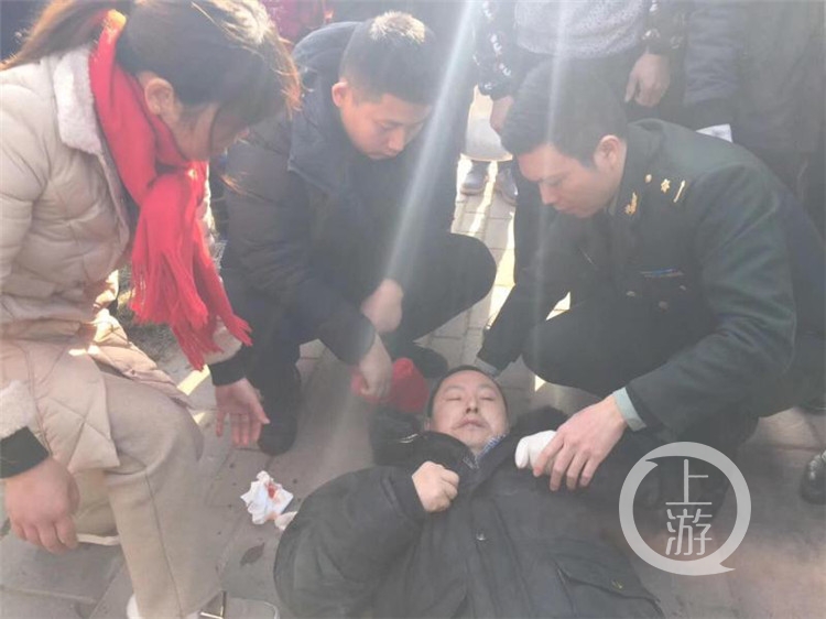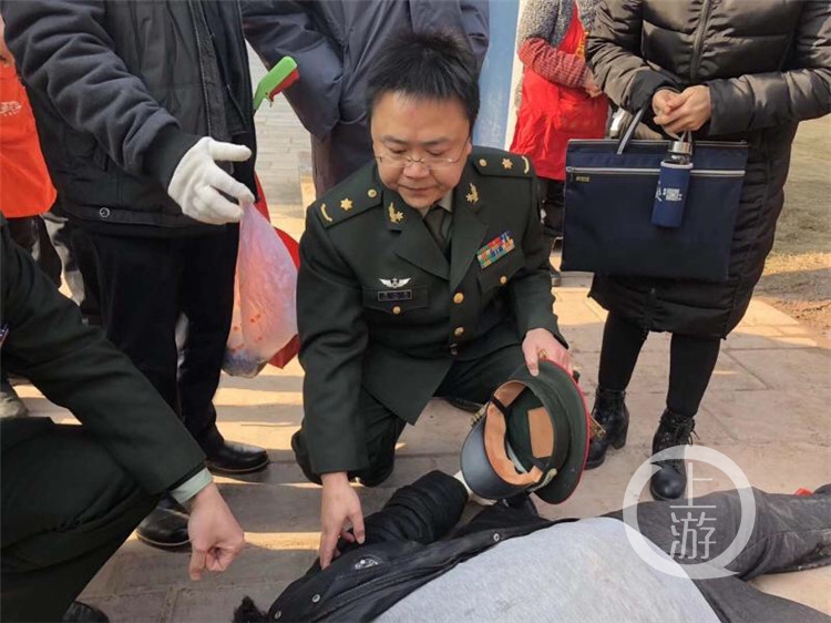 “快,停车,公路对面有人晕倒了!”1月10日上午11时,陆军军医大学新桥医院20余位军医和护理人员执行完任务回单位,所行车辆行至重庆市沙坪坝区凤鸣山到上桥(金色悦城)路口处时,车上人员见到公路对面一男子晕倒在地,带队的医教部教务科科长张椿立即叫司机停车,组织相关的专家教授到公路对面救人。