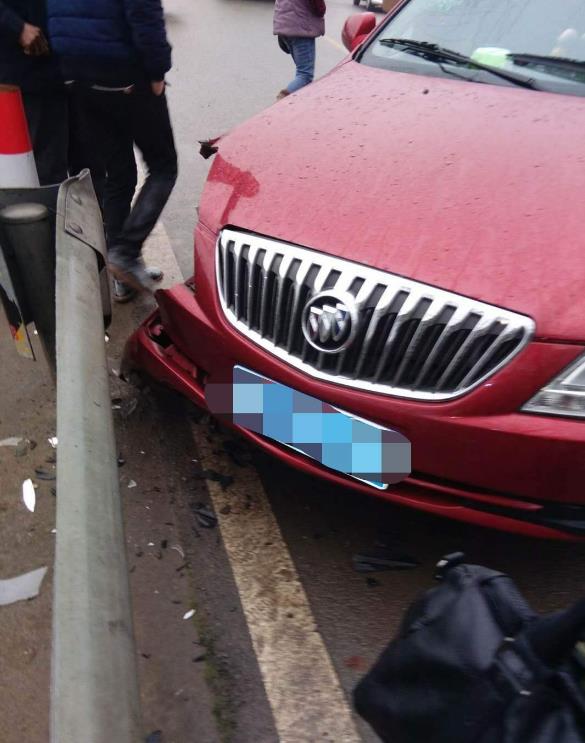 目击市民介绍,原来,在永川区谭家坡方向,红色轿车一家人在回娘家的路上,因驾驶员操作不当撞上了防护栏。