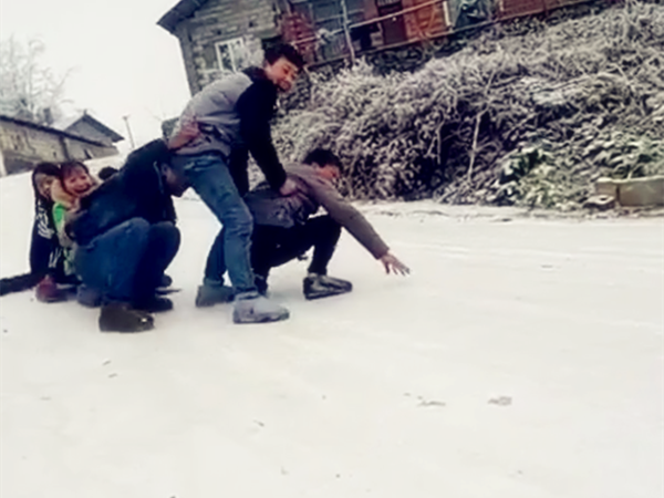 人们拿着板凳、纸板、木板或者塑料口袋等物品,垫在屁股下,充当滑雪工具。然后选择有坡度的路,居高临下,借助坡度,风驰电掣,一路狂奔下来。