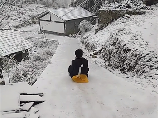 2018年1月29日,在重庆彭水的一个小镇上,一望无垠的全是白色的雪,已经堆积得很厚了。不少市民将斜坡路当成了滑雪场,开始了滑雪征程,到处充满欢声笑语。