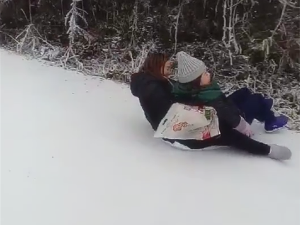 路面秒变滑雪场 市民自制器具滑雪