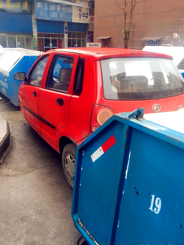 一辆红色的三轮车傲然屹立在垃圾箱中间,周围都被堵得死死的。
