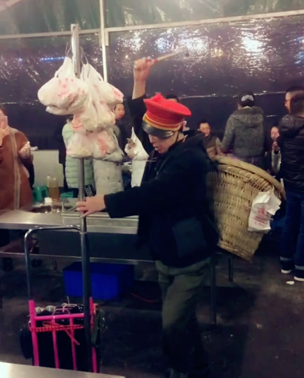 大叔看着约50岁左右,穿着黑色上衣,军绿色的解放鞋,头上顶着一个大红色的帽子,肩上背着一个大大的竹编背篓和筛子,十分吸睛。