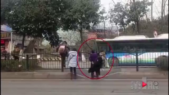 阿姨,当心闪着您的腰!当地居民介绍说,这里以前曾经画有人行横道线,但因为交通组织的需要,一个星期前被取消了,护栏也是那时候安装的。不过,有些人还是习惯从这里过马路,即使要翻越护栏。