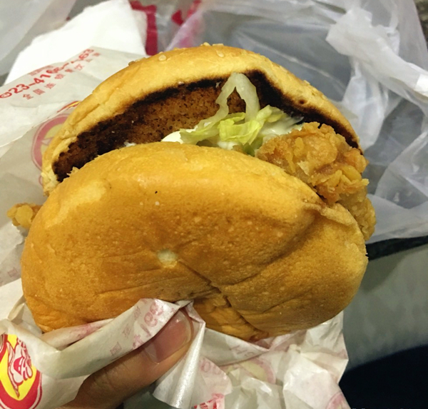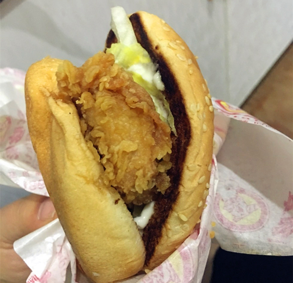 汉堡的外形正常,都是两片洒满白芝麻的面包块,中间夹着炸鸡,混合着生菜沙拉,看着美味多汁,直流口水。