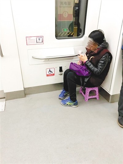 女子自带板凳坐地铁 一点也不违和
