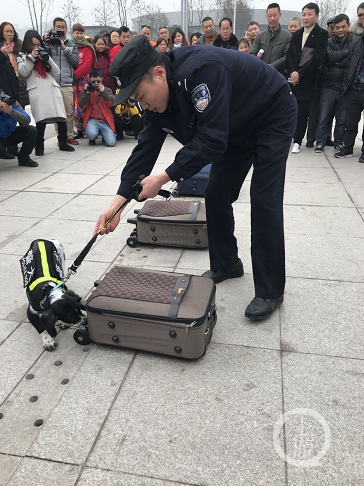 2月7日,今年首次投入使用的重庆西站广场上,六个箱子整齐地排列在广场上,缉爆犬朱迪在“缉爆”演练时,迅速地从六个行李箱中找到了含有“硝铵”纱布的箱包,并按指定方式报告训犬员。这是重庆铁路警方在重庆火车北站开展的“警犬助阵春运保平安出行 齐祝旅客群众狗年大吉”主题活动中发生的一幕。