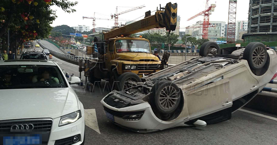 原来事发时袁某着急赴朋友约会,于是一路开车快行,当行驶至渝航路一路口时,正在左侧车道行驶的她,看到右转信号灯还有3秒绿灯就变黄灯了,为了少等一个信号灯的时间,她猛踩油门,提前往右侧变道,企图在3秒之内,快速越线并入右转车道上。可是,由于车速过快,车子出现漂移,右侧车轮撞到了隔离护栏上,车子瞬间腾空飞了起来,然后翻转360度,再“四轮朝天”地重重摔在了马路中间。幸好袁某系了安全带,在弹出的安全气囊和安全带的双重保护下,才没有受到更大的伤害,只有轻微脑震荡。