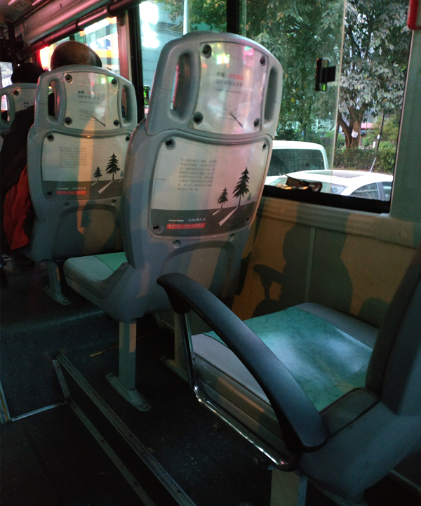 扶手下方是不锈钢的,上面是黑色的防滑塑胶,外形与公交车座椅显得格格不入,环顾四周,全车上就这一个座椅有扶手。