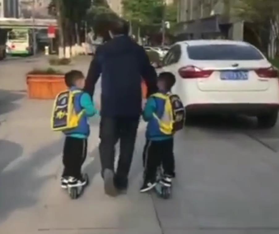 厉害了!73岁大爷用滑板遛双胞胎上学