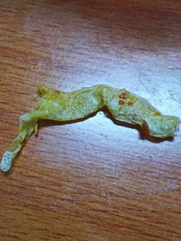 这张“鸡皮”沾满了油渍,仿佛是一条金黄色的蛇皮。这东西为什么会出现在鸡爪里?不少网友猜测是店员的疏忽,才发生了这样的事情,店家应该更细心才对。