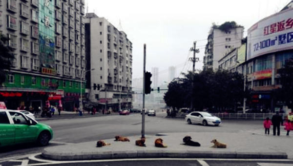 道路上车水马龙,人潮涌动,可是狗狗们仿佛什么都感觉不到,依旧悠闲地躺在红绿灯路沿处,十分惬意。