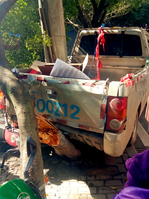 小货车当街“无人驾驶” 撞断行道树