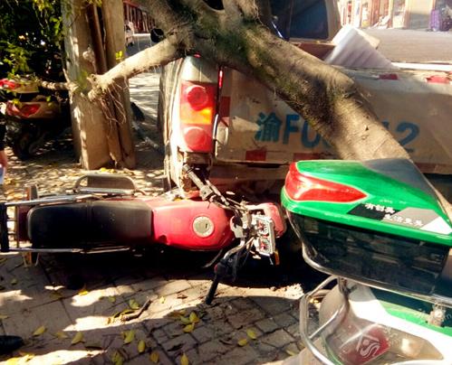 在人行道旁,停放着几辆摩托车,其中一辆被突然驶来的货车撞倒在地,倒地的这棵行道树还压住了别的摩托车,落叶散满一地。